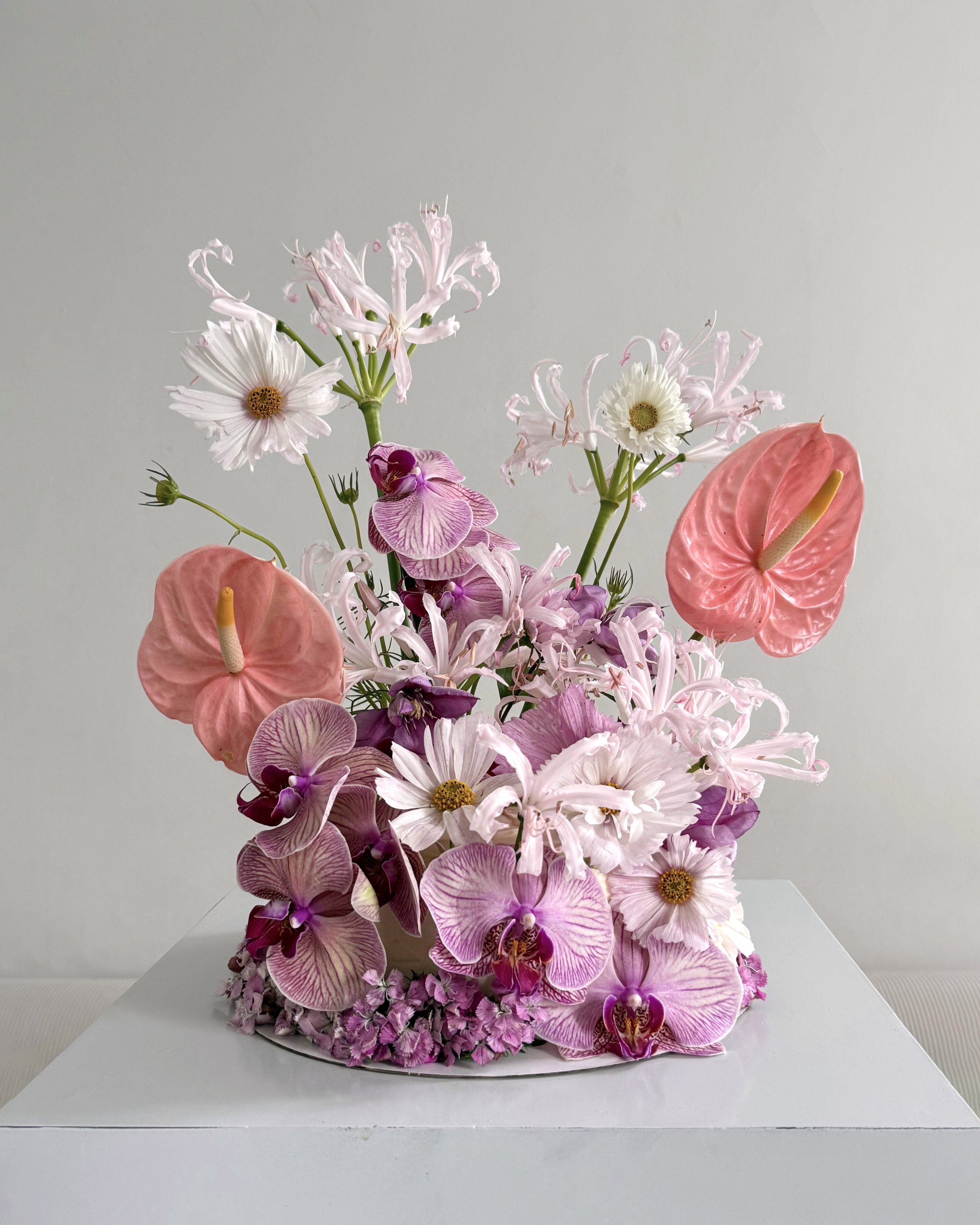 floral design @ chouchou is an extension of form — considered, composed, and deeply intentional. working primarily with roses and seasonal blooms, we favor warm, muted tones and sculptural balance, ranging from restrained minimalism to expressive abundance. each arrangement is tailored to the mood of the cake and the moment it’s made for, with bespoke palettes available upon request.